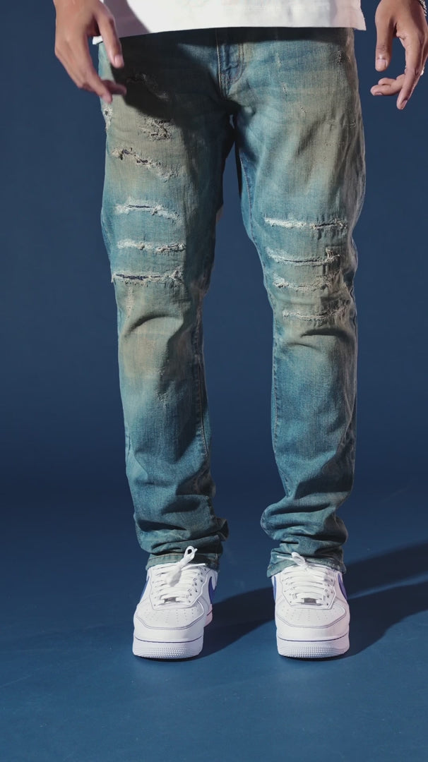 • Rip and repair design with raw denim backing