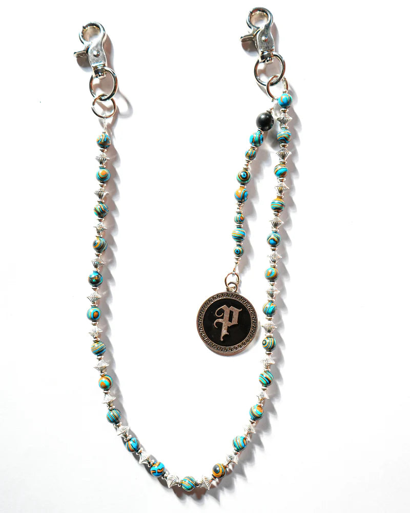 Channel raw coastal energy with the Neptune Signal Denim Chain Accessory — a standout piece featuring aqua-tone swirl beads and precision-crafted silver-tone cone spacers. This denim chain redefines street utility with an artistic edge, secured by dual lobster clasps and finished with PREME’s signature medallion. Designed to elevate any fit, from distressed denim to bold outerwear, it’s a tactical detail made for those who command presence.