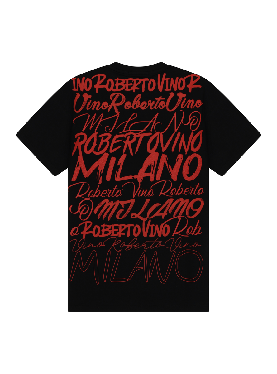The Big Writing T-Shirt delivers a striking streetwear aesthetic with its bold typographic design. Featuring an all-over "Roberto Vino Milano" print in red across the back, this tee makes a statement from every angle.